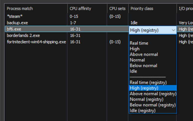 Double-click an executable name or its full path, depending on how precise you want the matching to be. Keep in mind that for registry-backed (IFEO) priorities, the base filename must be used.